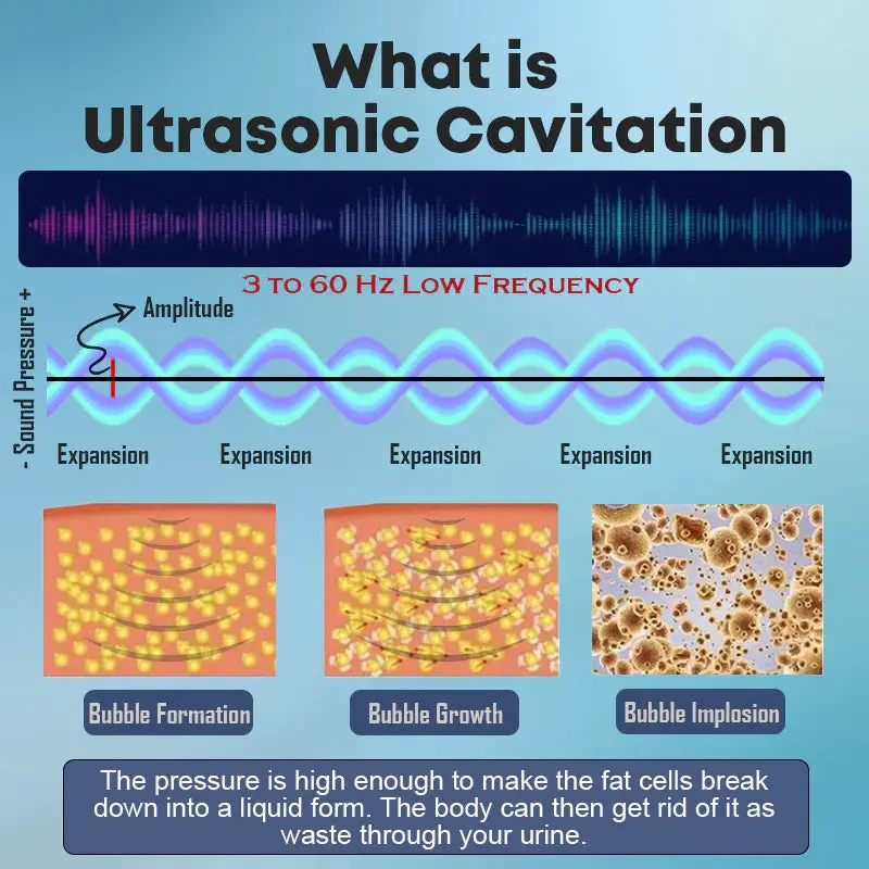 Ultrasound therapy is a non-invasive, cutting-edge treatment.The American Institute of Ultrasound in Medicine (AIUM) has demonstrated its ability to eliminate toxins and reduce body fat. It utilizes the “cavitation” effect of sound waves to produce a series of pressure changes that directly target fat tissue. This action induces fat cells to oscillate, rupture and break down, effectively treating stubborn fat deposits and cellulite.