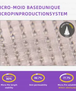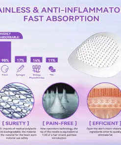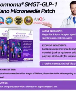 Each needle is 0.27 millimeters in length, just 1/7th the thickness of a hair, and is made from dissolvable ingredients such as Meglutide and BOTOX. 1 patch of the ingredients produces results equivalent to a high-end joint treatment program with PRP or stem cell injections.These micro-needles are precision-engineered using cutting-edge manufacturing techniques to ensure a seamless, pain-free experience while effectively delivering the active ingredients directly into the skin.