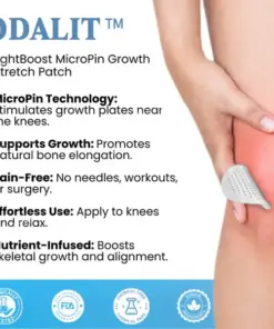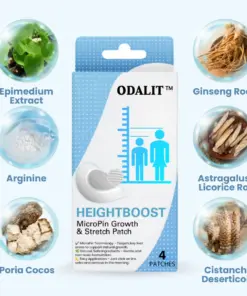 The ODALIT™ HeightBoost MicroPin Growth & Stretch Patch is an innovative, non-invasive solution designed to naturally support height enhancement. Applied directly to the knees, each patch uses advanced MicroPin technology to gently stimulate growth plates and deliver active nutrients that promote bone elongation and improved posture. Safe, painless, and easy to use, it’s a trusted choice for individuals seeking gradual height gain without resorting to surgery or intense exercise. Backed by positive feedback across the U.S., ODALIT™ offers a modern approach to unlocking your full growth potential.