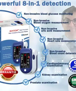 BQYOOM™’s latest innovation, the Smart Multifunctional Non-Invasive Laser Blood Glucose Meter, integrates state-of-the-art technology for superior health monitoring. THE DEVICE USES AN EXTREMELY ENERGY-EFFICIENT INTELLIGENT MCU CONTROLLER AND AN ADVANCED “LAMBERT BEER” ALGORITHM TO ENSURE HIGHLY ACCURATE MEASUREMENTS. It combines photonic chip technology and silicon and light absorption spectroscopy to provide reliable, non-invasive monitoring of blood glucose, blood pressure, and blood oxygen levels. The device is BfArM certified and includes six display modes for easy and comprehensive health monitoring. Whether you’re managing diabetes, monitoring cardiovascular health, or tracking oxygen levels, BQYOOM™ offers a trusted, all-in-one solution for your health needs.