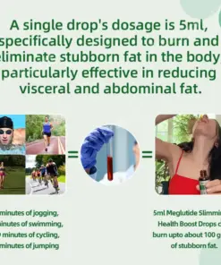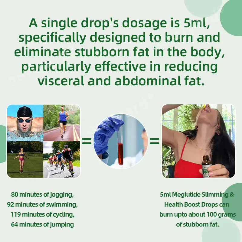 Studies have shown that 5 ml of Meglutide Oral Solution can burn up to about 100 grams of stubborn fat. And it takes a long time to burn 50 grams of fat through exercise (80 minutes of jogging, 92 minutes of swimming, 119 minutes of cycling, 64 minutes of jumping rope). The dose of one dropper is 5 ml and is specifically designed to burn and eliminate stubborn fat from the body, especially effective in reducing visceral and abdominal fat.