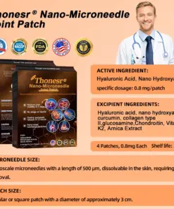 The Thonesr® Nano-microneedle joint patch is a breakthrough solution for joint pain and support. This innovative patch combines the powerful healing properties of Hyaluronic Acid (HA) with advanced precision microneedle technology to deliver deep, precise treatment where it matters most.