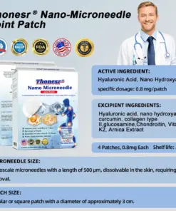 The Thonesr® Nano-microneedle joint patch is a breakthrough solution for joint pain and support. This innovative patch combines the powerful healing properties of Hyaluronic Acid (HA) with advanced precision microneedle technology to deliver deep, precise treatment where it matters most.
