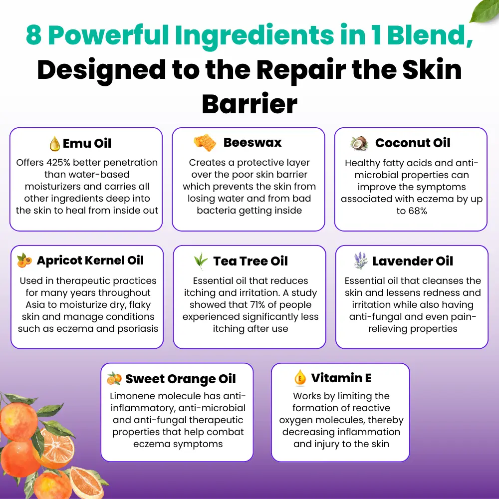 Putting emu oil on the skin is literally like giving our skin the building blocks that it needs to repair the Poor Barrier Function and break the Eczema Cycle!