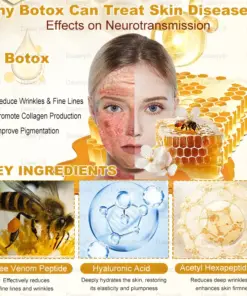 Daasry® Bee Venom Skin Treatment Cream uses bee venom peptides to mimic the effects of Botox, relaxing facial muscles and reducing the formation of expression lines. At the same time, hyaluronic acid deeply hydrates the skin, making it plump and effectively smoothing fine lines and wrinkles. The combination of Acetyl Hexapeptide-8 and botulinum toxin targets deep wrinkles like forehead lines and crow’s feet, leaving your skin looking firmer and smoother.