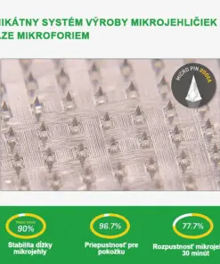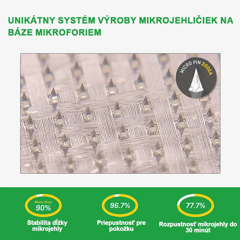 Každá ihla má dĺžku 0,27 mm, čo je len 1/7 hrúbky vlasu, a je vyrobená z rozpustného liečiva. Tieto mikročastice sú presne navrhnuté pomocou moderných výrobnych techník, aby zabezpečili bezproblémový a bezbolestný zážitok, pričom účinné zložky sú efektívne dodávané priamo do pokožky.
